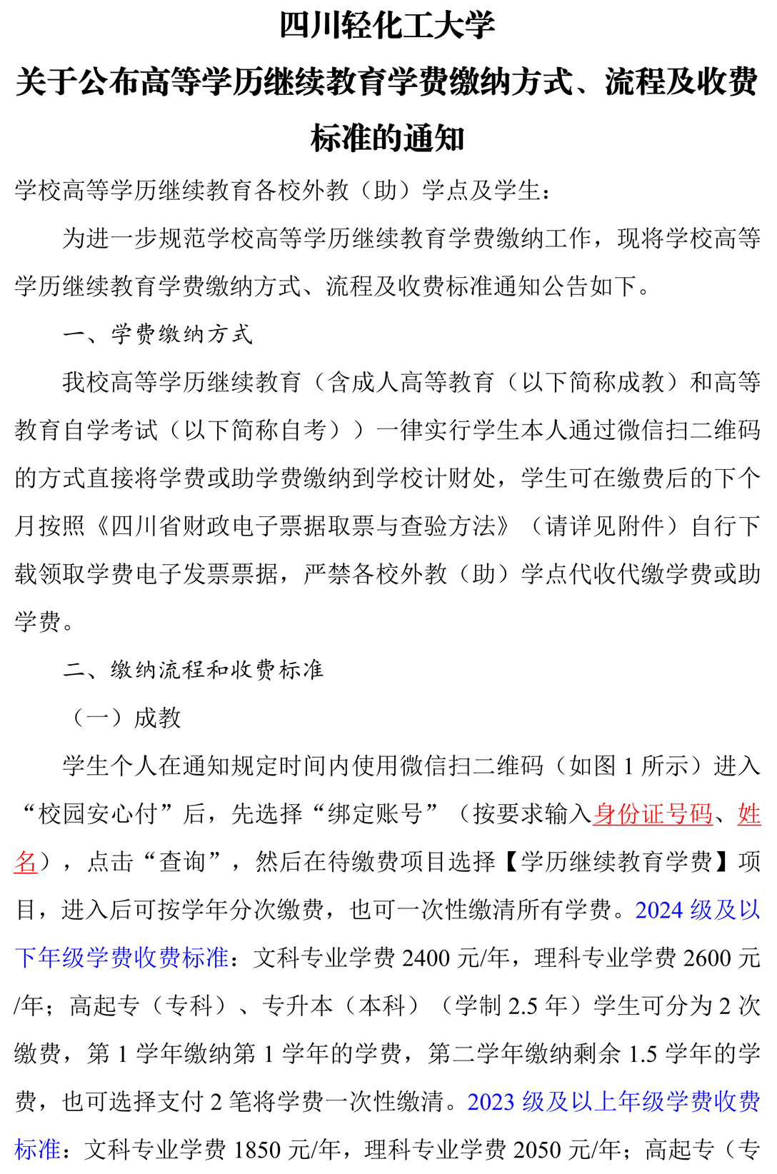 四川轻化工大学关于公告高等学历继续教育学费缴纳方式、流程及收费标准的通知